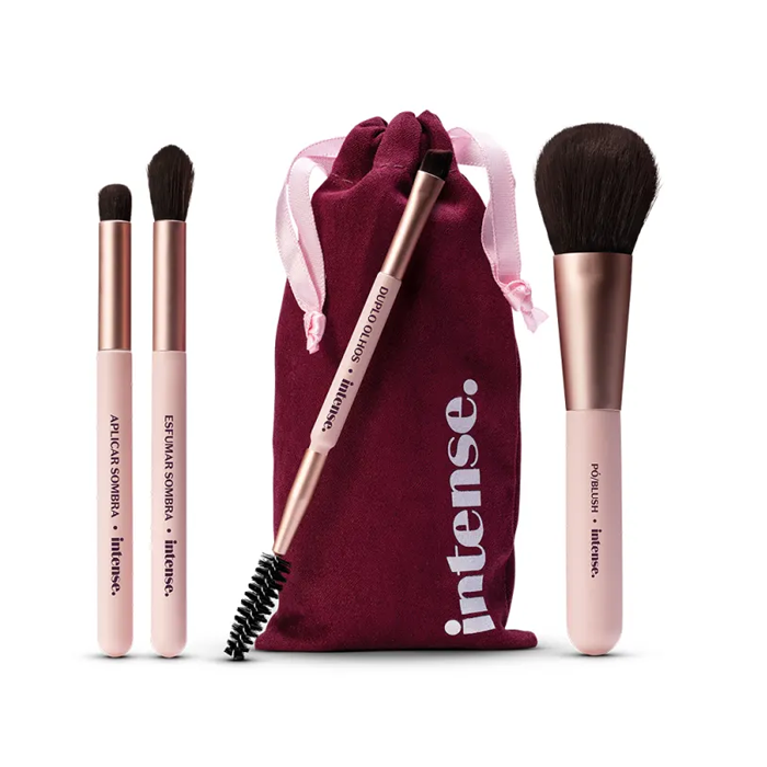 Kit com 4 pincéis para maquiagem e 1 saquinho de tecido. Kit o Boticário Intense Mini Pincéis para Maquiagem é ideal para arrasar na maquiagem e garantir praticidade.